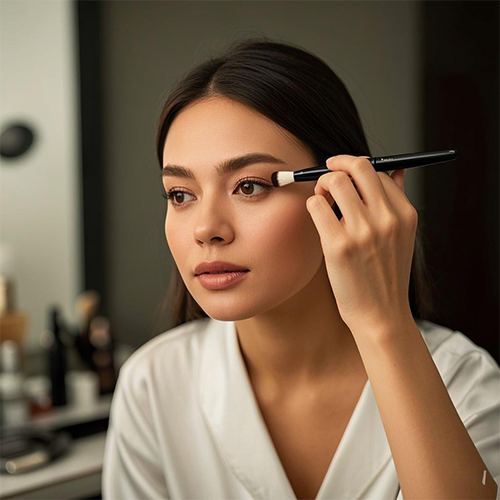 有泡泡眼困擾的人,沈陽化妝學校建議可以試試式胳巧:刷于眼睛上的眼影,以有收斂效果的深色為佳。舉例來說,淺棕色刷于眉骨打底,深棕色則用大型眼刷大片且快速刷開于眼窩處,就能創(chuàng)造深邃的眼睛輪廓。注意,含有亮粉的珠光眼影會制造膨脹感,眼睛浮腫的人絕對要避免。