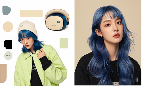 霧霾藍(lán)發(fā)色,冷色調(diào)發(fā)色的-種,陽(yáng)光下比室內(nèi)光線(xiàn)更明顯,搭配搭配中長(zhǎng)卷發(fā),高級(jí)感滿(mǎn)滿(mǎn)。?