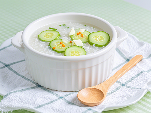 將米飯、鮮黃瓜300克、精鹽2克、姜粉10克作為主食。青瓜洗凈,去皮去心切成薄片。將米洗凈,姜洗凈拍碎。加水約1000毫升,置火上,下米、姜,文火煮開后,用文火慢慢煮至米爛,下黃瓜片,煮至湯濃稠,加入精鹽調味。