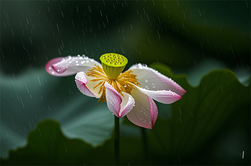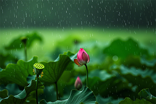首先要選擇有遮風(fēng)檔雨的長(zhǎng)廊或者有亭臺(tái)樓閣的荷花池塘進(jìn)行拍攝雨荷;這樣能夠避免相機(jī)和鏡頭在拍攝過(guò)程中過(guò)量涉入雨水。其次,雨天容易發(fā)生雷閃電,為了個(gè)人安全,還是選擇有遮擋的地方。
