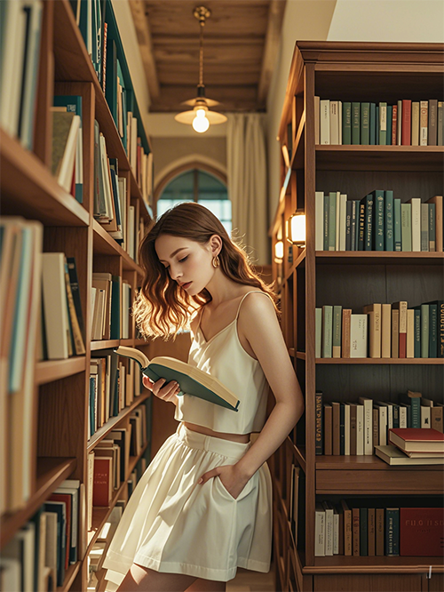 人物動作:靠著書架坐下,撐起雙腿,低頭看書,露出鏡頭一方的側(cè)臉或讓頭發(fā)自然垂落。