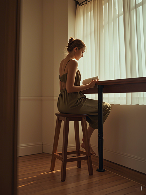 人物動作:側(cè)坐高凳,背部挺直,低頭看書,微微露出側(cè)臉輪廓。