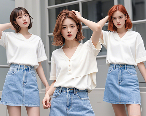 搭配4:撩耳短發(fā)+V領(lǐng)上衣+牛仔短裙