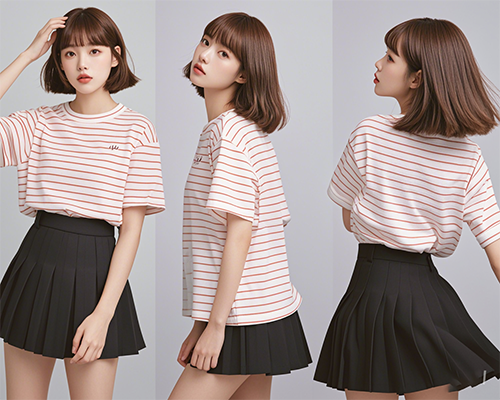 搭配1:空氣劉海短發(fā)+條紋t恤+黑色短裙