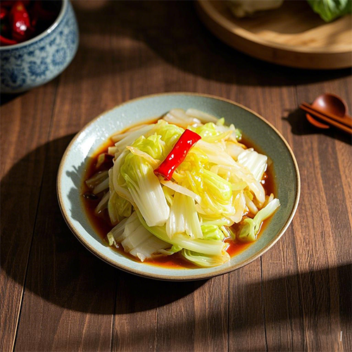 【食材】:大白菜 適量、蔥蒜 適量、鹽 1小勺、淀粉 1勺、陳醋 3勺、生抽 2勺、辣椒 適量、白糖 1小勺、