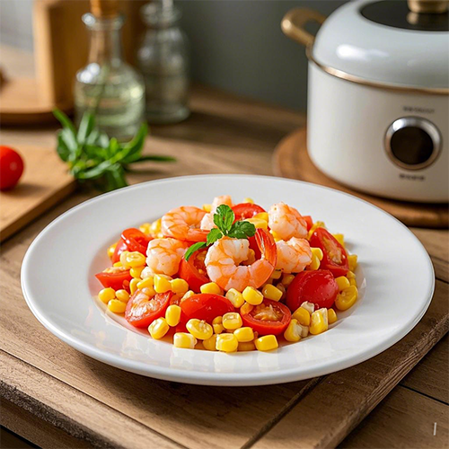 【食材】:鮮蝦 適量、料酒 1勺、番茄 適量、玉米粒 適量、鹽 1小勺、糖 1勺