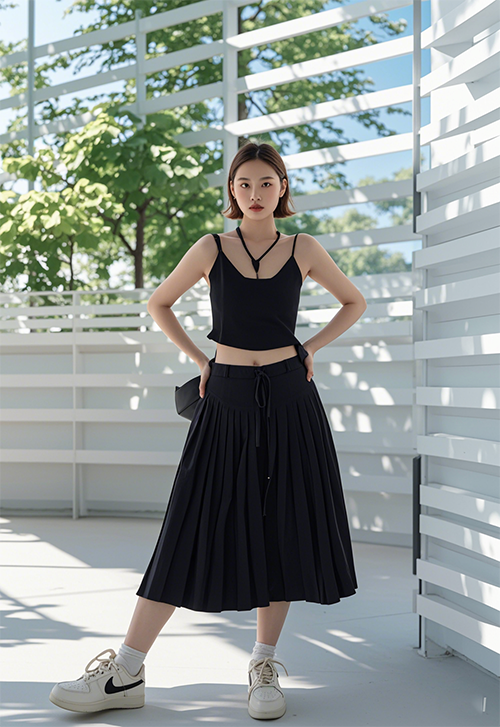 穿衣法則中有個竅門,就是上半身暴露,下半身就要保守,上半身保守,下半身就可以短點。這個穿搭竅門,其實就是為了平衡漏膚度。因為吊帶和熱褲的搭配是在太過于性感不好駕馭,穿不好會顯得很俗氣,漏膚度太高。