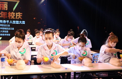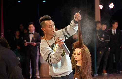 隨后進(jìn)行的是美發(fā)系競賽環(huán)節(jié)。美發(fā)精剪班和美發(fā)燙染班率先登場,分別進(jìn)行了剪發(fā)和排杠技藝的展示和競賽;美發(fā)系主任陳剛老師則在教師風(fēng)采展示環(huán)節(jié)中,演繹了令人拍案叫絕的晚裝盤發(fā)技巧,盡展美發(fā)大師的風(fēng)范。