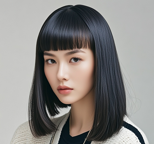 對于長臉的女生,齊眉的厚重劉海或許是個(gè)驚喜的選擇。它能夠有效地縮短臉部長度,增加上庭的視覺比重,使整體比例更加協(xié)調(diào)。搭配直發(fā)或是微卷的發(fā)型,既能展現(xiàn)復(fù)古風(fēng)情,又不失現(xiàn)代感,讓你的長臉在人群中獨(dú)樹一幟。