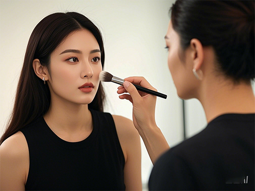 ?法令紋?:選擇淺米色啞光遮瑕,用扁平刷精準(zhǔn)填充凹陷處,并向蘋果肌方向暈染,制造“提拉感”;