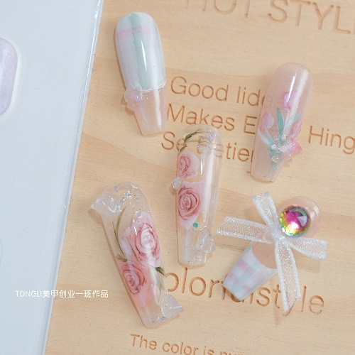高級課程:熟練使用打磨機(jī)、噴槍等工具,制作 3D 卡通彩繪、光療延長甲,嘗試水晶雕花、琉璃美甲。還有店務(wù)管理課,教你開店運(yùn)營、客戶管理等實(shí)用技巧。