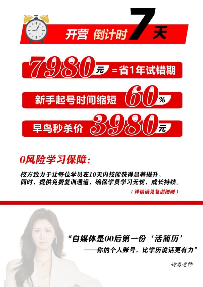 新媒體行業(yè)正處于飛速發(fā)展的黃金時(shí)期,短視頻更是成為了人們生活中不可或缺的一部分。如今,正是搶占這個(gè)風(fēng)口的最佳時(shí)機(jī)。如果你還在猶豫不決,當(dāng)你終于下定決心要進(jìn)入這個(gè)領(lǐng)域時(shí),紅利可能已經(jīng)溜走。統(tǒng)麗學(xué)校超級(jí)新星千萬(wàn)流量短視頻IP特練營(yíng),為你提供了一個(gè)快速進(jìn)入新媒體行業(yè)、搶占風(fēng)口的絕佳機(jī)會(huì)。別再讓機(jī)會(huì)從指縫中溜走,勇敢地邁出這一步,加入我們,一起開(kāi)啟你的新媒體創(chuàng)業(yè)之旅!
