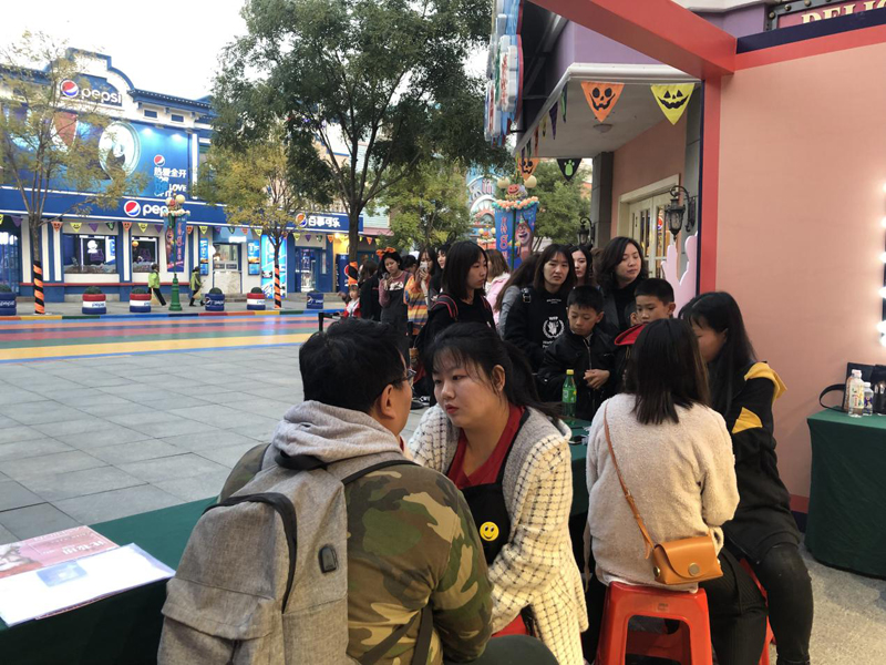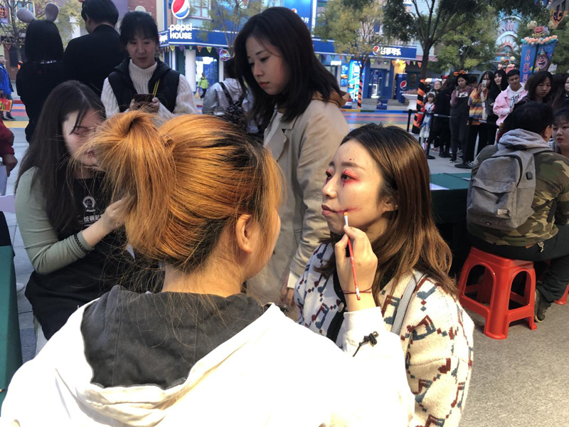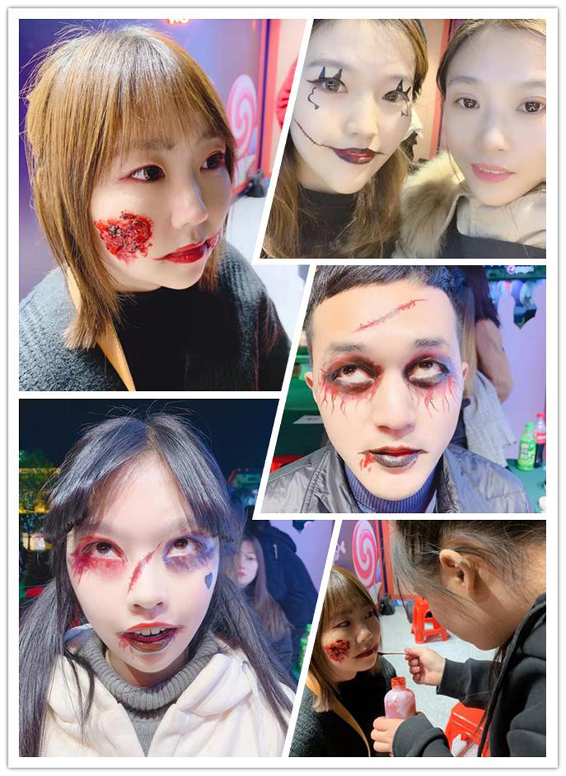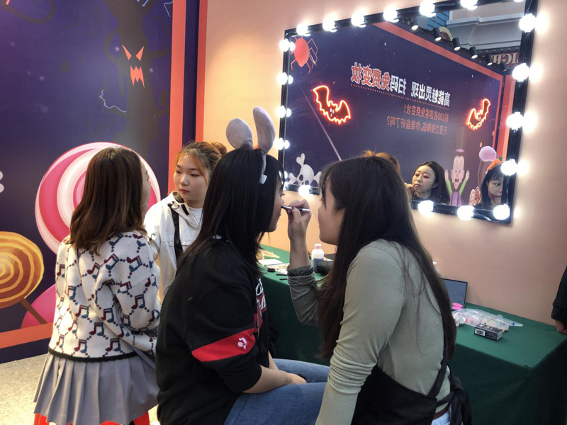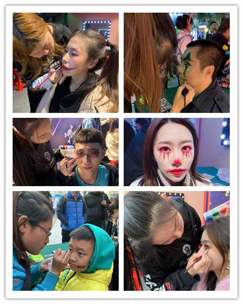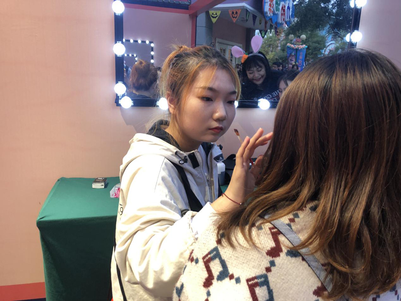 此次活動閉幕式,自然少不了國際化妝班的身影!李春杰老師再一次帶領(lǐng)精英學員遠赴方特樂園,為閉幕式提供助妝服務(wù)。天氣漸寒,但游客依舊接踵,熱切期待著屬于自己的“鬼面”。