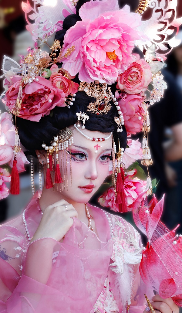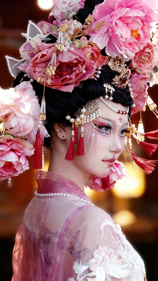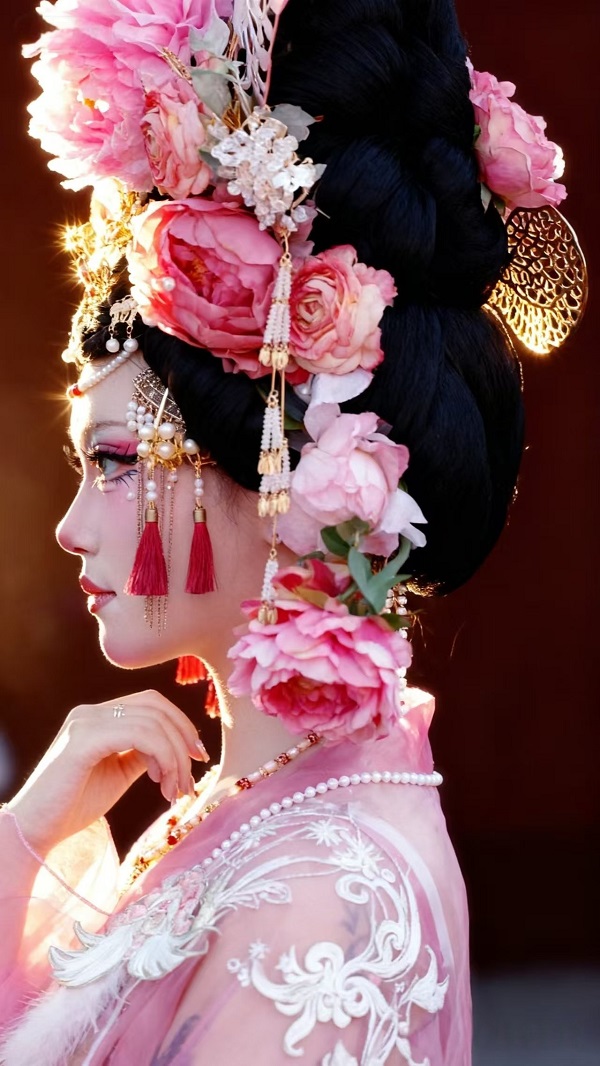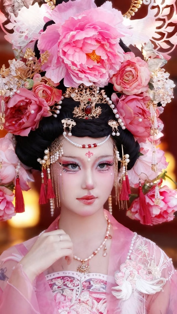 整體搭配更是 “錦上添花”,額頭中央的紅色花鈿的點綴,既強化了古風(fēng)辨識度,又與唇色、眼尾深粉形成色彩呼應(yīng)。頭上的大朵粉色牡丹、金色飾件與珍珠流蘇步搖,搭配粉色薄紗服飾,讓妝容、頭飾與服裝色調(diào)統(tǒng)一,構(gòu)成和諧的整體,將古典美人的艷麗與精致展現(xiàn)得淋漓盡致。