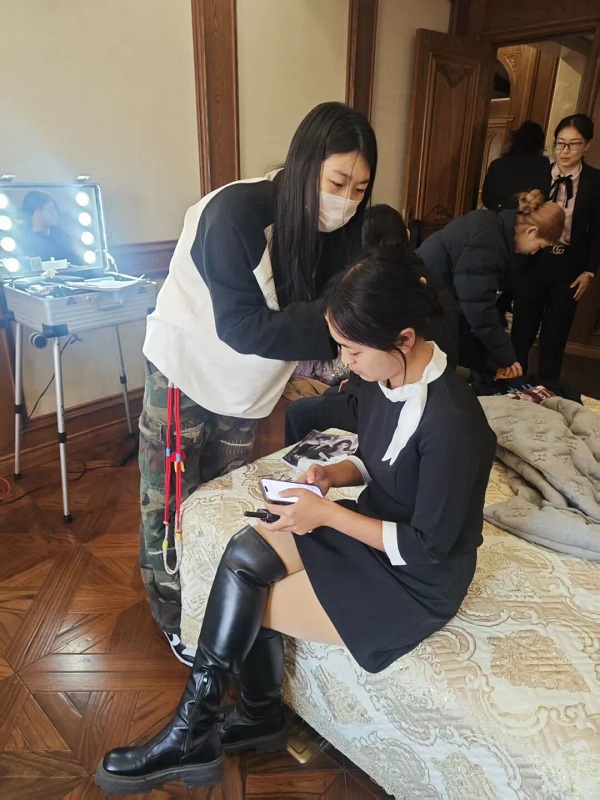 鏡頭轉(zhuǎn)向劇組化妝間,統(tǒng)麗學(xué)子正全神貫注地為演員打造造型: