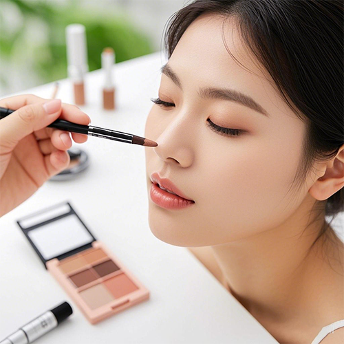 (2)淺色修容涂在額頭、下巴、鼻梁及眼下三角提亮,眼下三角記得要在眼袋黑眼圈以下的位置。