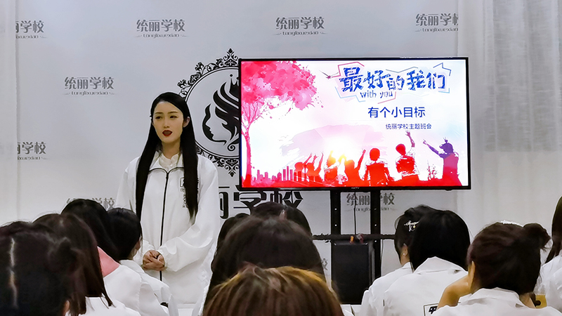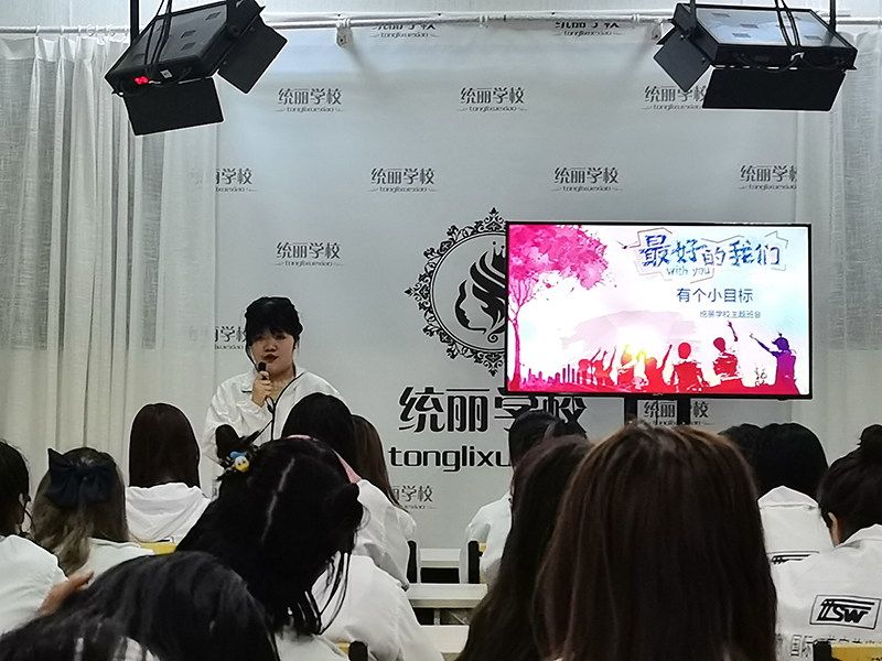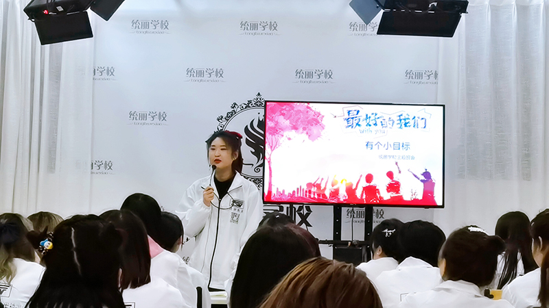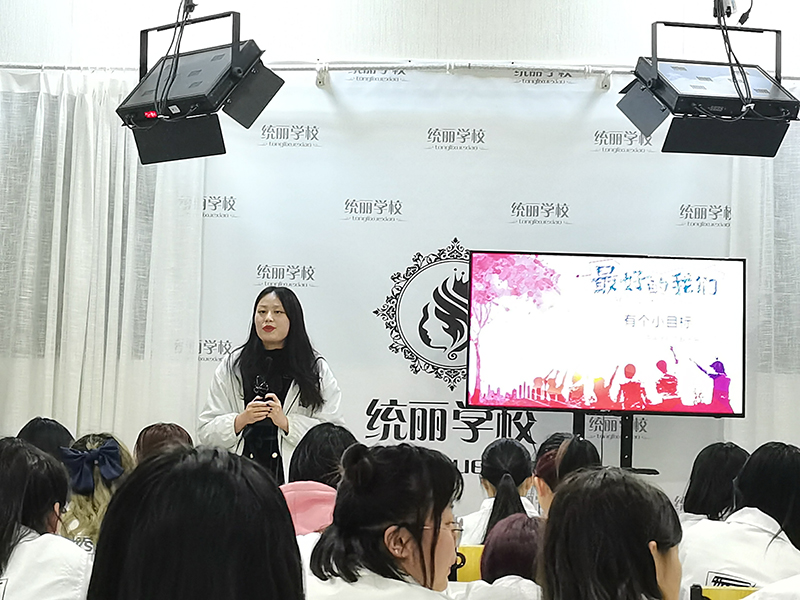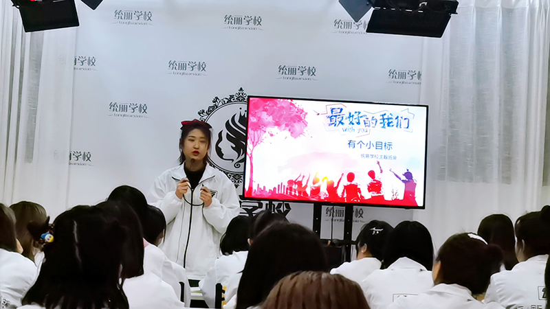 隨后,高老師播放了精心準(zhǔn)備的視頻資料,并邀請(qǐng)大家將觀后感和自身經(jīng)歷相結(jié)合,道出自己的“小目標(biāo)”。學(xué)員們認(rèn)真地觀看了視頻,有的人還在筆記本上認(rèn)真記錄著。班長(zhǎng)張文婷同學(xué)率先上臺(tái)發(fā)言,她先是談到了在統(tǒng)麗學(xué)習(xí)多年的感受,將統(tǒng)麗比作充滿愛心、溫暖、歡樂的大家庭,同時(shí)也是一個(gè)必須憑借努力、嚴(yán)謹(jǐn)、勤奮才能拾階而上的美業(yè)技術(shù)殿堂。在談到自己的“小目標(biāo)”時(shí),張文婷談到了一位在羋月傳劇組跟妝的統(tǒng)麗學(xué)姐,稱自己的目標(biāo)是成為一名優(yōu)秀的跟組化妝師,而且正在為之而努力。