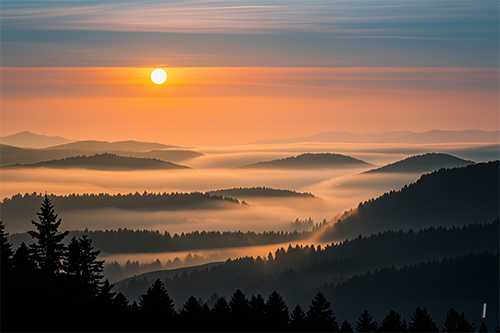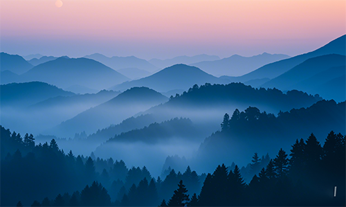 在山區(qū)黎明時分,樹林的水汽會形成輕輕的薄霧,山巒線條在云霧的影響下,有了深淺的變化,增加了畫面的朦朧深遠的效果。